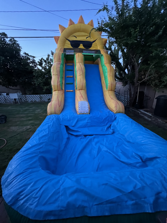Make a splash with this 15-foot-tall, single-lane sunshine water slide. Climb up and zip down into a cool splash landing—perfect for backyards, birthdays, and hot summer days. One rider at a time keeps things safe and smooth; requires a garden hose, a standard outlet, and a level, open setup area.