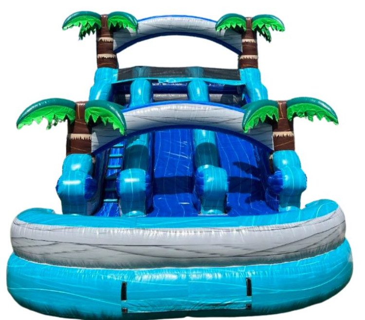Bring big-time excitement and tropical vibes to your event with our 18FT Tropical Double Lane Water Slide, a towering inflatable designed for fast, competitive fun. Featuring bright ocean-blue colors, palm tree accents, and two side-by-side sliding lanes, this unit lets riders race to the splash pool for nonstop thrills.